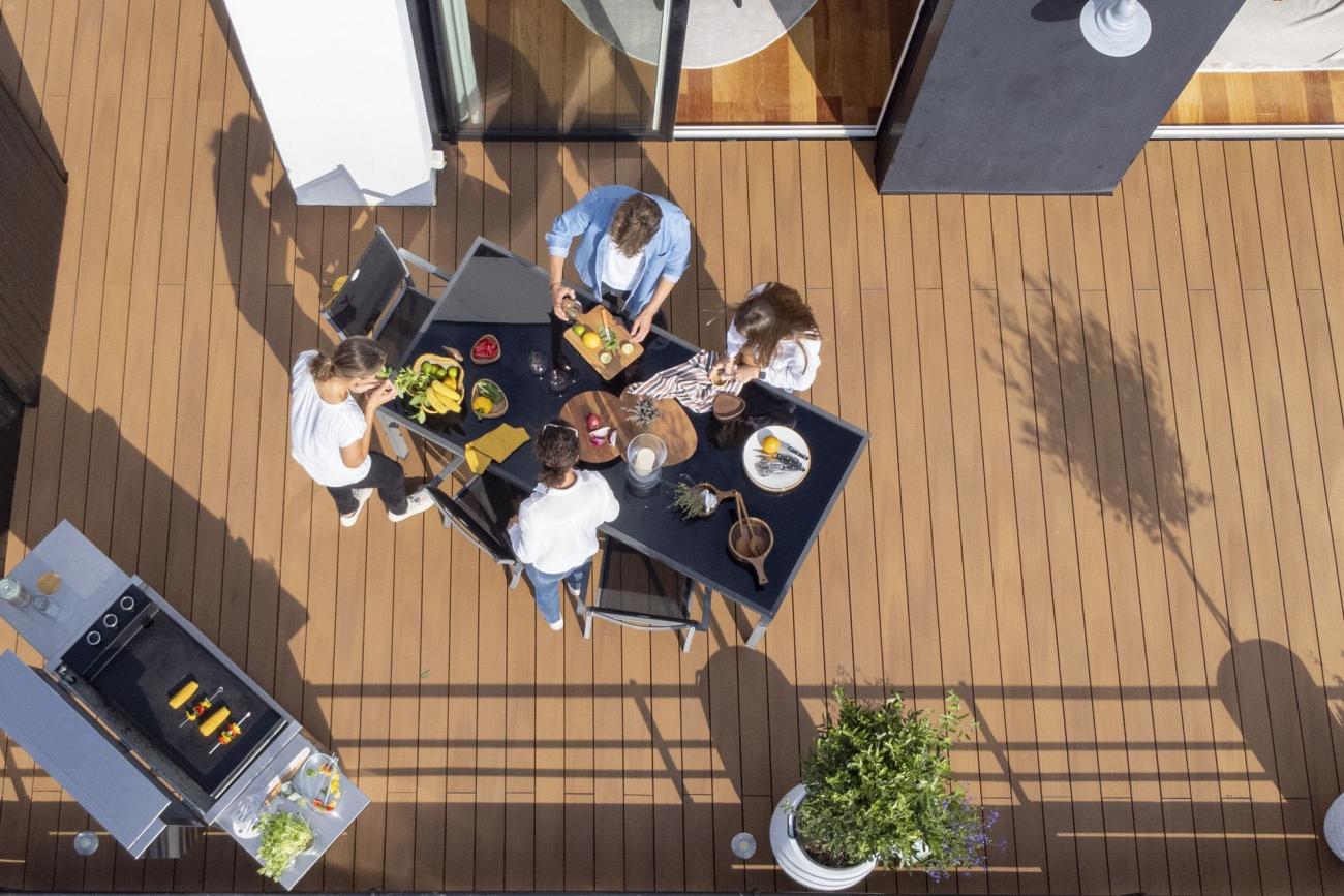 Deska Atmosphere, nadająca się do każdego terenu, świetnie sprawdza się na tarasach, podestach, przejściach, chodnikach, na działkach prywatnych lub w budynkach, w których panuje duży ruch, na przykład na tarasach kawiarni, hoteli czy restauracji. Plamy powstałe w wyniku zwykłego użytkowania są bardzo łatwe do wyczyszczenia. Produkt nadaje się zatem do zewnętrznych kuchni, w których można spokojnie cieszyć się wspólnym biesiadowaniem podczas posiłków na wolnym powietrzu.