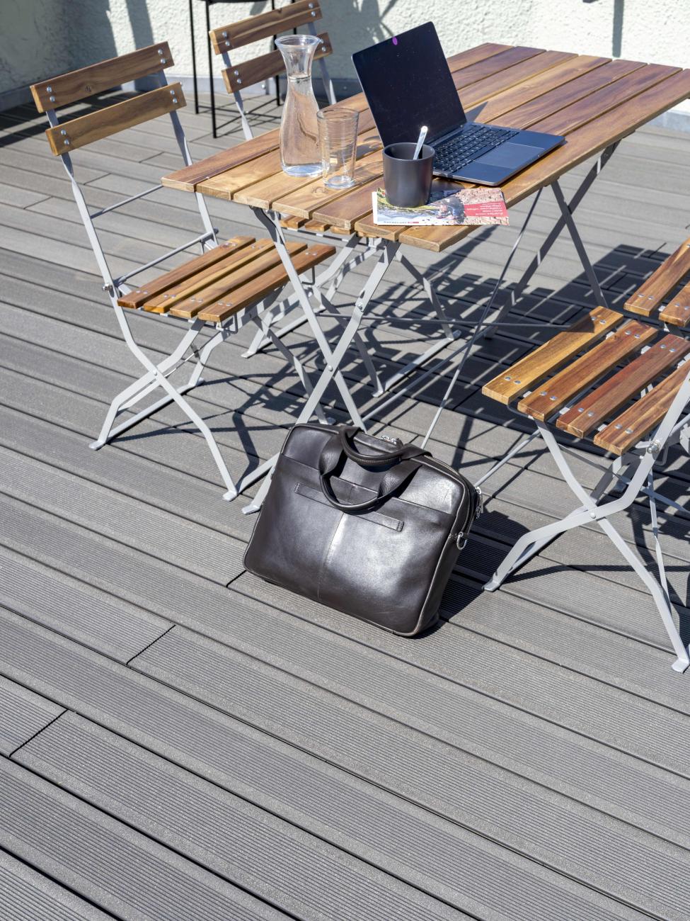 Nasze ryflowane deski tarasowe Elegance mają wszystkie zalety potrzebne w przypadku tradycyjnego tarasu z drewna kompozytowego: mają bardzo dobre właściwości antypoślizgowe, zarówno dla bosych stóp, jak i butów.