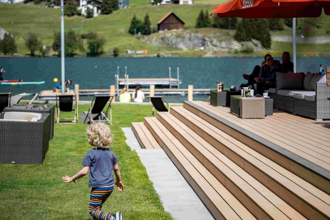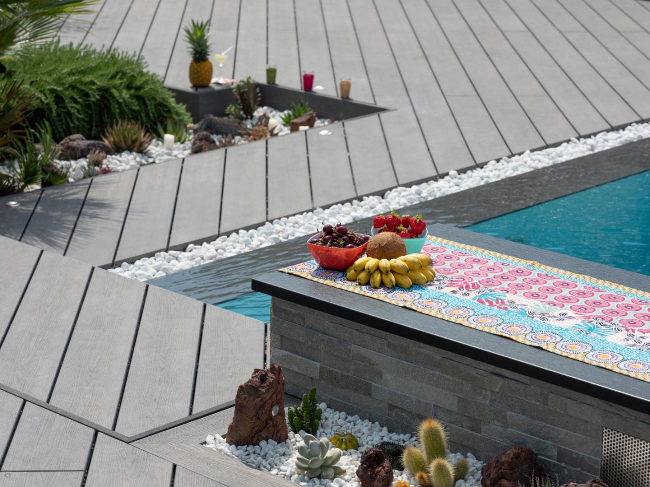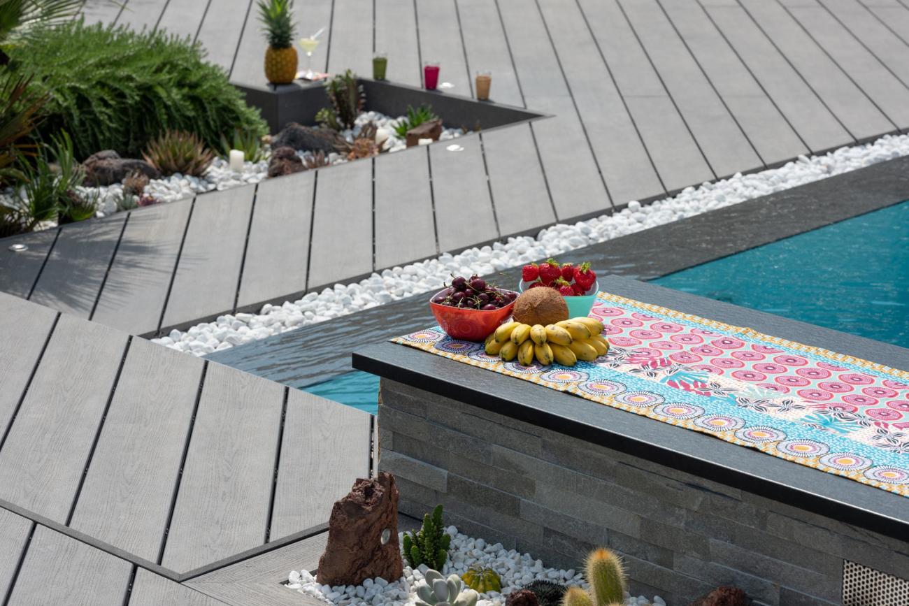 Poszukujesz deski tarasowej, aby wykończyć obszar wokół basenu? Strukturyzowana deska Elegance idealnie nadaje się do tego zastosowania. Gładkość jej wykończenia powoduje, że jest ona szczególnie przyjemna w dotyku dla bosych stóp. Nasze deski tarasowe Elegance mają bardzo dobre właściwości antypoślizgowe w przypadku bosych stóp. Są wygodne dla bosych stóp, ponieważ nie mają drzazg. Nie szkodzi im ani chlor, ani sól, ani ogólnie żadne środki do konserwacji basenu. Przy aranżowaniu przestrzeni wokół basenu zalecamy wybieranie jasnych kolorów, które są lepsze dla bosych stóp, ponieważ takie deski nie będą nagrzewać się bardziej niż taras z drewna egzotycznego.